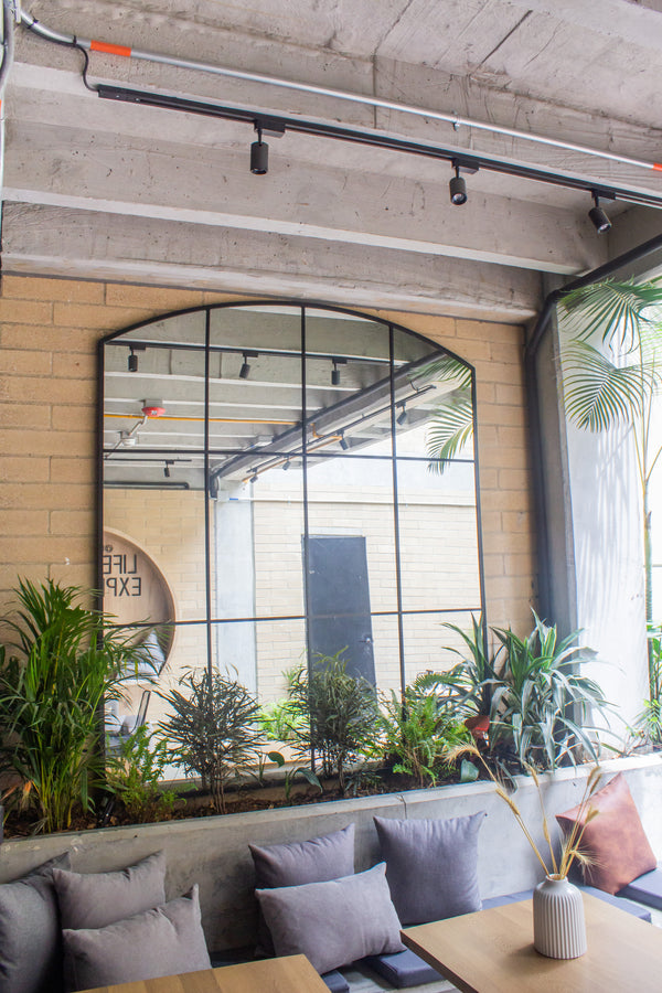 Nuestro espejo tipo ventana compuesto por líneas en rectángulo, está hecho en estructura metálica, con acabado en pintura electroestática. Incluye sistema seguro para colgar o asegurar a pared como estando de piso.