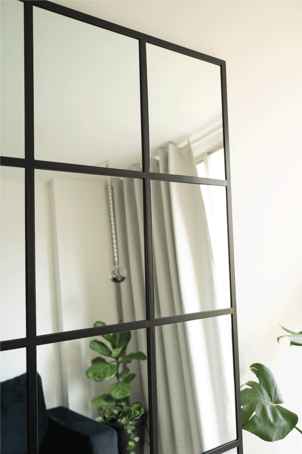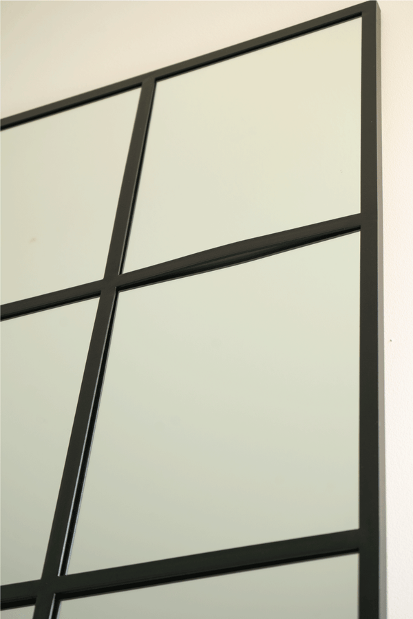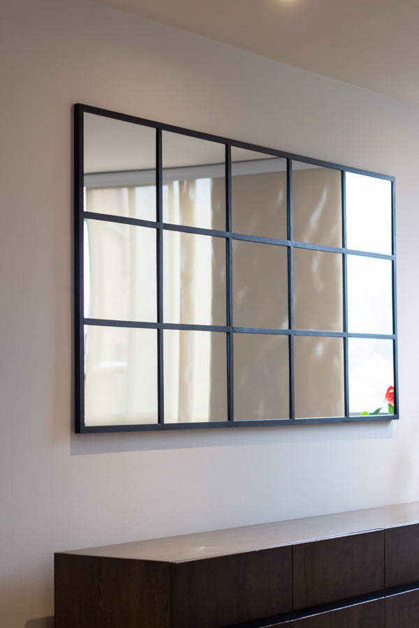 Nuestro espejo tipo ventana compuesto por líneas en cuadrícula, está hecho en estructura metálica, con acabado en pintura electroestática. Incluye sistema seguro para colgar o asegurar a pared como estando de piso.