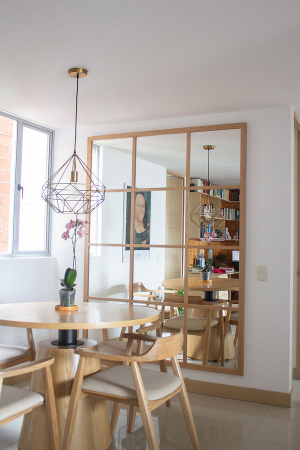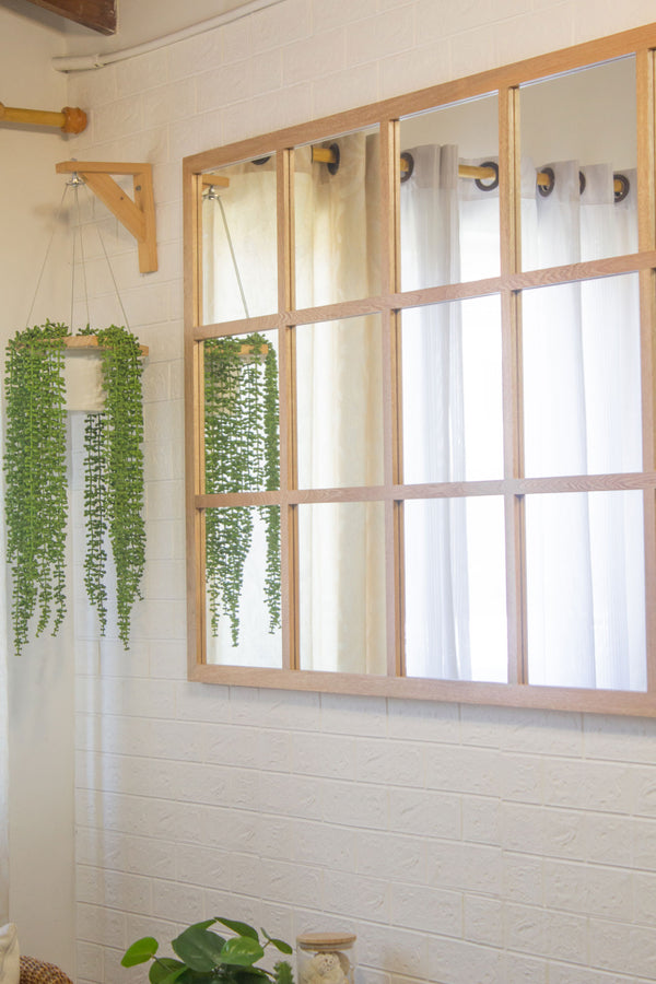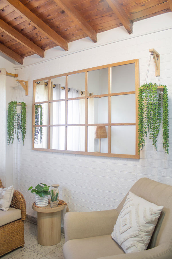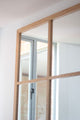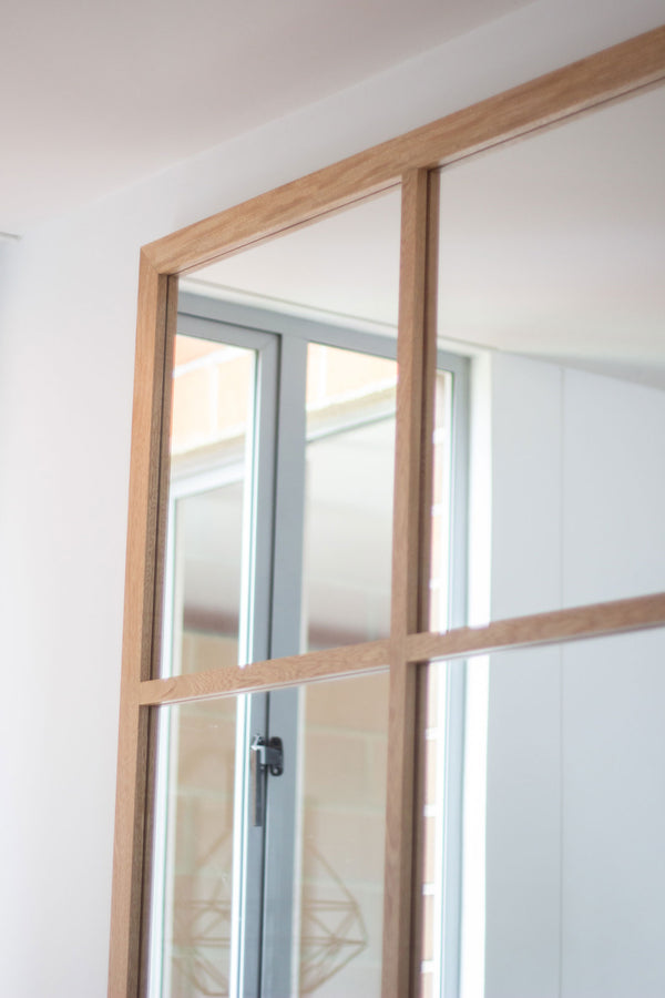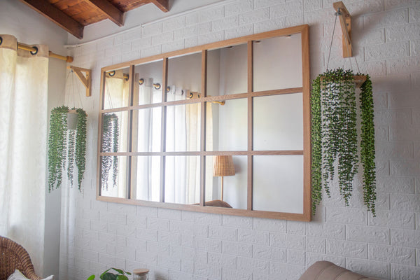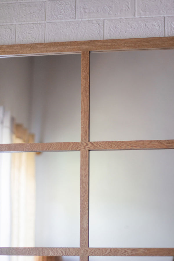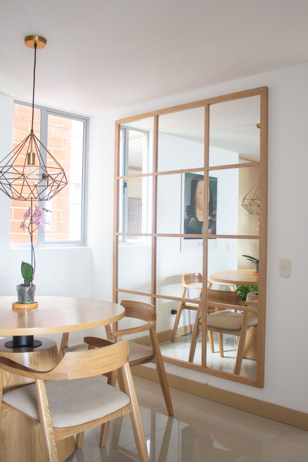 Este espejo tipo ventana está hecho con marco en madera de roble, con acabado en laca para repeler el polvo y la suciedad. Incluye espaldar en mdf para proteger la película del espejo, y sistema seguro para colgar o anclar de piso.