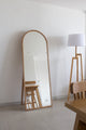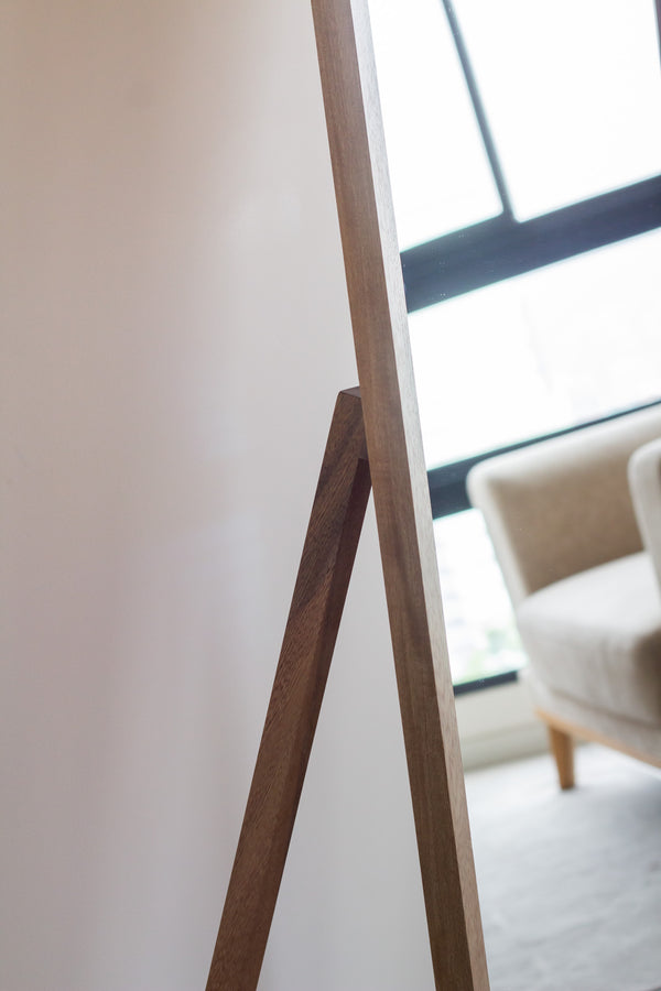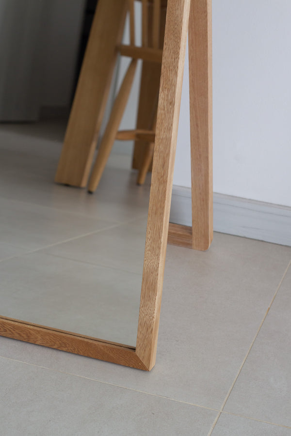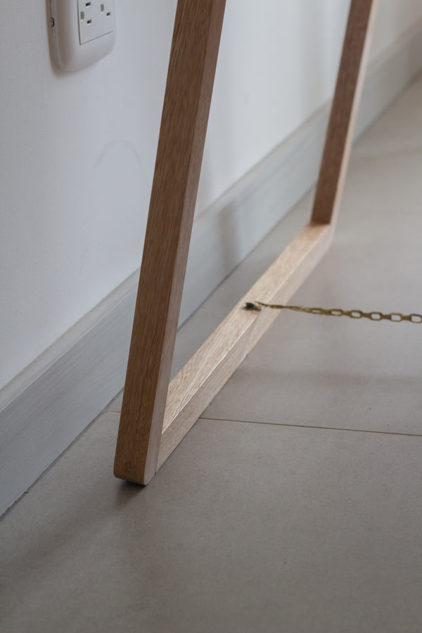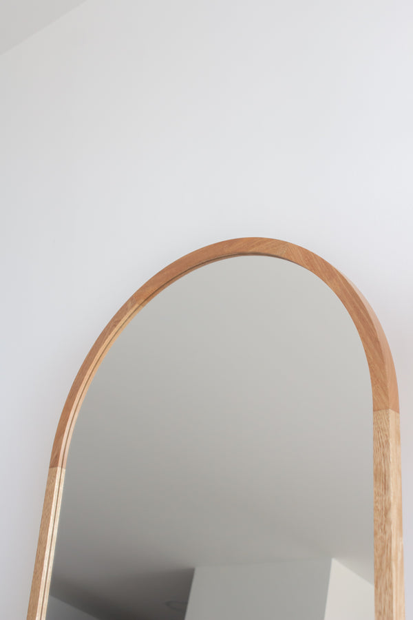 Este espejo en arco, con soporte de piso, está hecho con marco en madera de roble, con acabado en laca para repeler el polvo y la suciedad. Incluye base de piso abatible que abre y cierra, con la base cerrada podrás recostarlo en pared con opción de anclaje para evitar incidentes. Incluye también espaldar en MDF, para proteger el espejo.