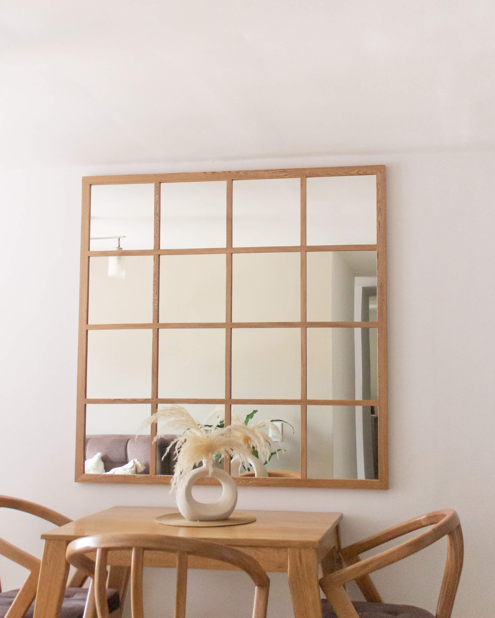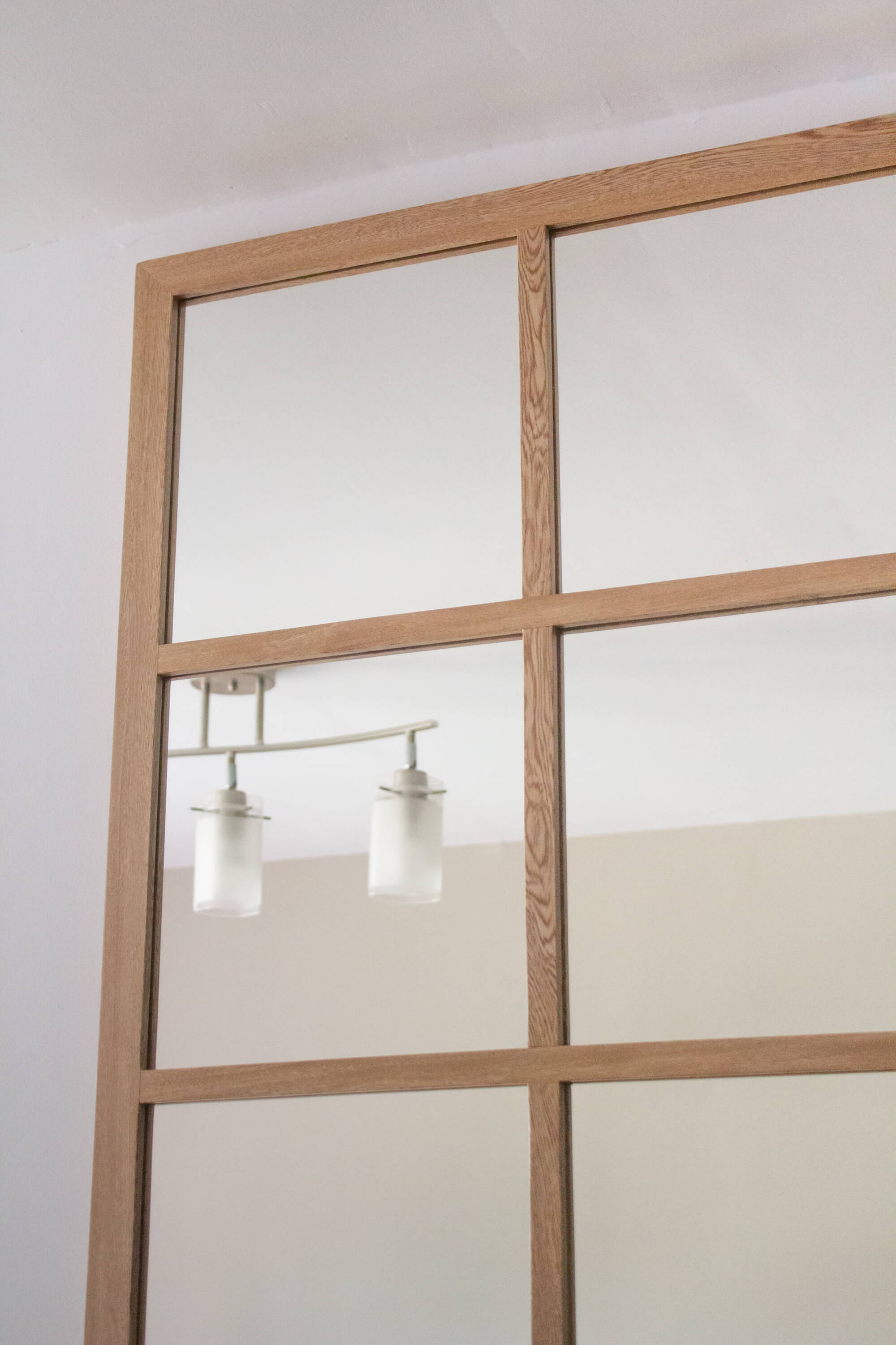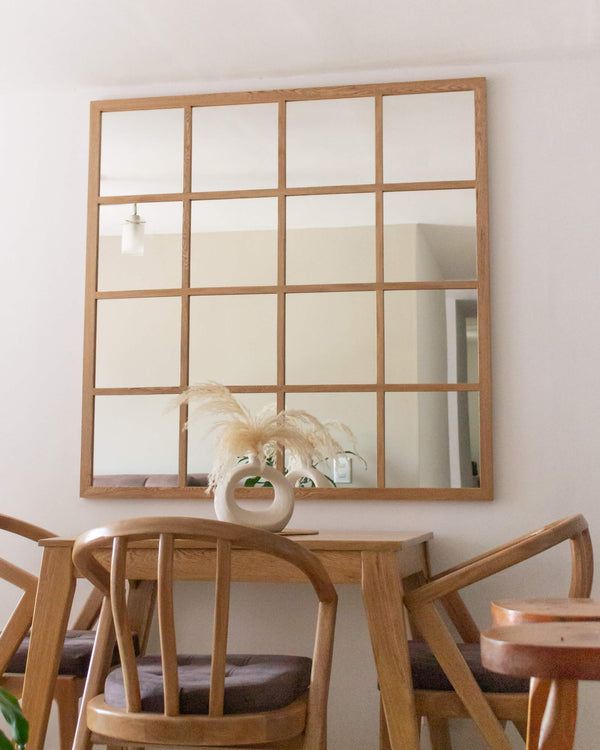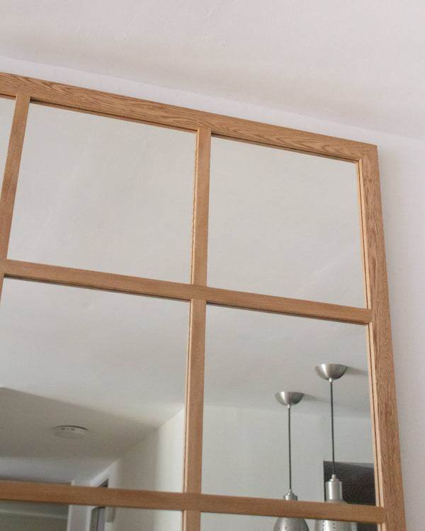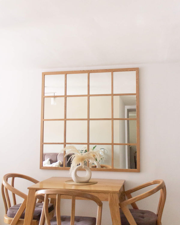 Este espejo tipo ventana está hecho con marco en madera de roble, con acabado en laca para repeler el polvo y la suciedad. Incluye espaldar en mdf para proteger la película del espejo, y sistema seguro para colgar (queda fijo, no se moverá al limpiar)