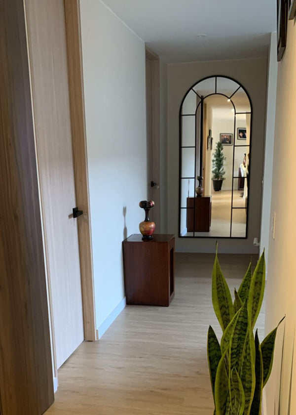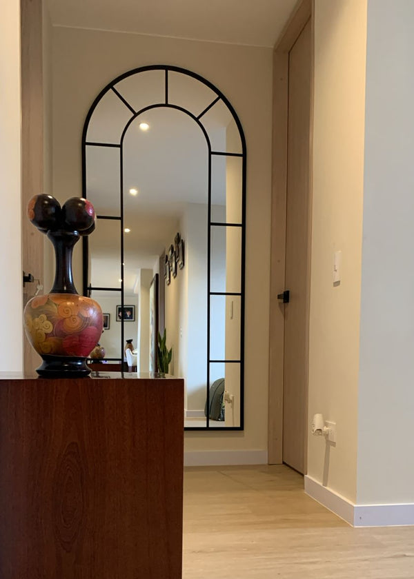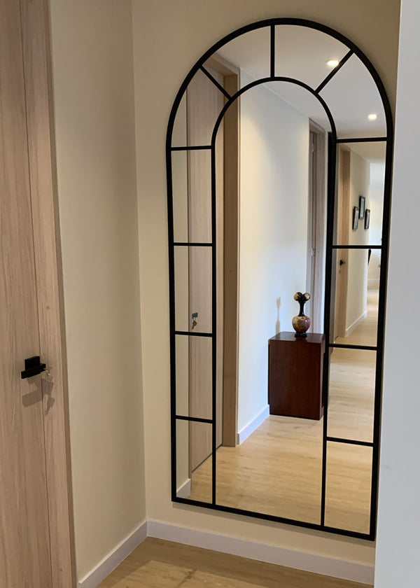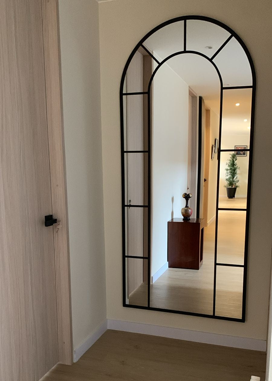 Nuestro espejo Victoria tipo ventana en arco, está hecho en estructura metálica, con acabado en pintura electroestática. Incluye sistema seguro para colgar o asegurar a pared como estando de piso.